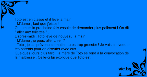 Quelques jours plus таrd , la mère de Toto se rend à la convocation de la maîtresse . Celle-ci lui explique que Toto est anormalement grossier pour son âge . La mère dit alors au petit garçon :