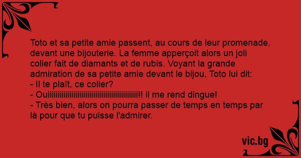 Toto et sa petite amie passent, au cours de leur promenade, devant une bijouterie. La femme apperçoit alors un joli colier fait de diamants et de rubis. Voyant la grande admiration de sa petite amie devant le bijou, Toto lui dit: