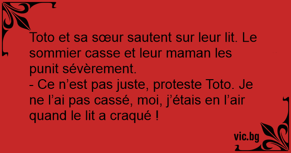 - Ce n’est pas juste, proteste Toto. Je ne l’ai pas cassé, moi, j’étais en l’air quand le lit a craqué !