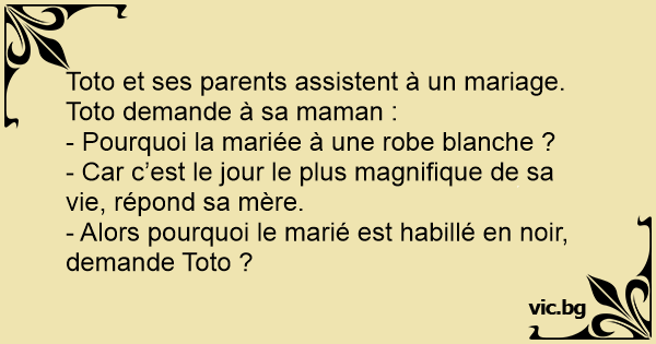 Toto passe devant une église avec sa maman, voyant sortir des jeunes mariés, il demande : - Maman, pourquoi la mariée est-elle en blanc ? - Parce que c'est le plus beau jour de sa vie ! - Et le monsieur alors, pourquoi est-il en noir ?