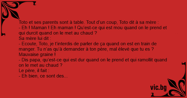 - Eh ! Maman ! Eh maman ! Qu’est-ce qui est mou quand on le prend et qui durcit quand on le met au chaud ?