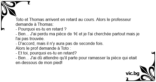 Toto et Thomas arrivent en rетаrd au cours. Alors le professeur demande à Thomas: