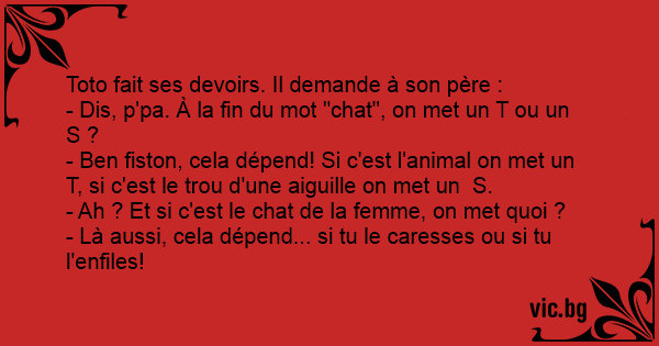 - Dis, p'pa. À la fin du mot "chat", on met un T ou un S ?