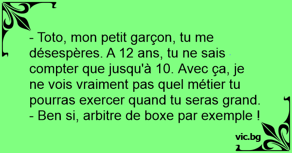 - Toto, mon petit garçon, tu me désespères. A 12 ans, tu ne sais compter que jusqu'à 10. Avec ça, je ne vois vraiment pas quel métier tu pourras exercer quand tu seras grand.