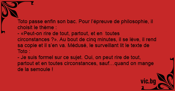 - «Peut-on rire de tout, partout, et en toutes circonstances ?». Au bout de cinq minutes, il se lève, il rend sa copie et il s’en va. Médusé, le surveillant lit le texte de Toto :