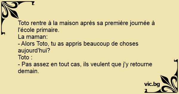 Een kind komt thuis van zijn eerste dag op school. Zijn moeder vraagt: "En, wat heb je vandaag geleerd?" Het kind antwoordt: "Niet genoeg, want ik moet er morgen weer naartoe."