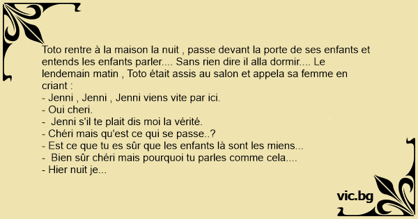 Toto rentre à la maison la nuit , passe devant la porte de ses enfants et entends les enfants parler.... Sans rien dire il alla dormir.... Le lendemain matin , Toto était assis au salon et appela sa femme en criant :