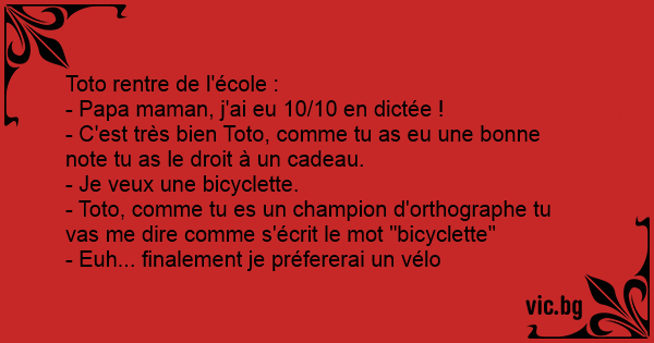 - Toto, comme tu es un champion d'orthographe tu vas me dire comme s'écrit le mot "bicyclette"