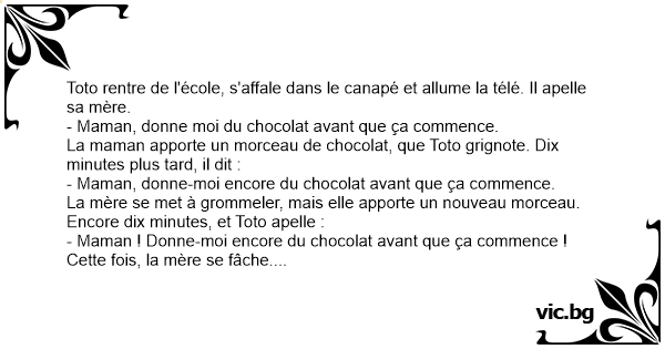 La maman apporte un morceau de chocolat, que Toto grignote. Dix minutes plus таrd, il dit :