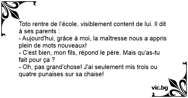Toto rentre de l’école, visiblement content de lui. Il dit à ses parents :