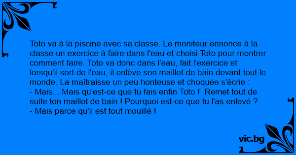 Toto va à la piscine avec sa classe. Le moniteur ennonce à la classe un exercice à faire dans l'eau et choisi Toto pour montrer comment faire. Toto va donc dans l'eau, fait l'exercice et lorsqu'il sort de l'eau, il enlève son maillot de bain devant tout le monde. La maîtraisse un peu honteuse et choquée s'écrie :