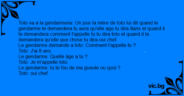 Toto va a la gendarmerie: Un jour la mère de toto lui dit quand le gendarme te demandera tu aura qu'elle age tu dira 8ans et quand il te demandera comment t'appelle tu tu dira toto et quand il te demandera qu'elle que chose tu dira oui chef.
