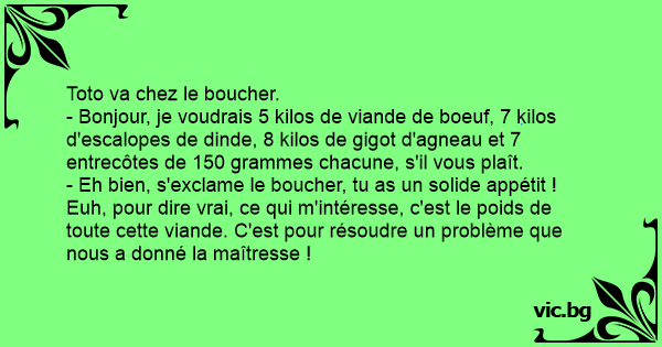 - Bonjour, je voudrais 5 kilos de viande de boeuf, 7 kilos d'escalopes de dinde, 8 kilos de gigot d'agneau et 7 entrecôtes de 150 grammes chacune, s'il vous plaît.
