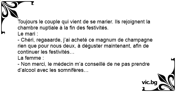 - Chéri, regaaarde, j’ai acheté ce magnum de champagne rien que pour nous deux, à déguster maintenant, afin de continuer les festivités…