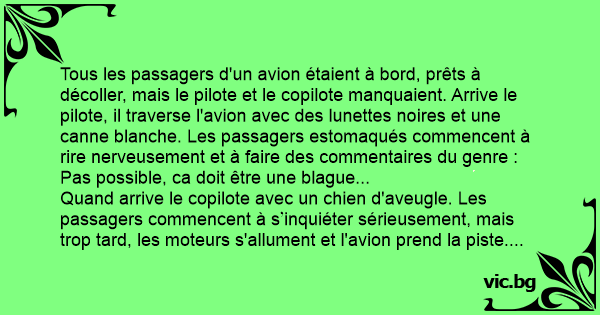 Tous les passagers d'un avion étaient à bord, prêts à décoller, mais le pilote et le copilote manquaient. Arrive le pilote, il traverse l'avion avec des lunettes noires et une canne blanche. Les passagers estomaqués commencent à rire nerveusement et à faire des commentaires du genre : Pas possible, ca doit être une blague...