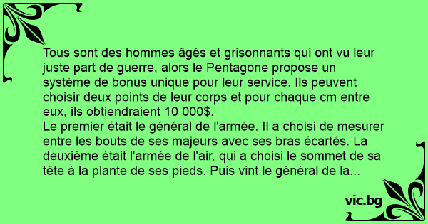Az USA hadserege nyugdíjba vonulása alkalmából három tábornokot kíván megjutalmazni. Arra kérik őket, hogy adjanak meg tetszőlegesen két testrész között egy távolságot, azt lemérik és...