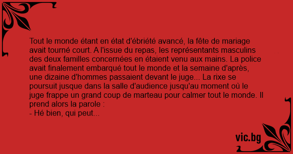 - Moi, j'étais le témoin du marié et je peux tout expliquer. Dans notre tradition, c'est toujours le témoin qui ouvre le bal avec la mariée. J'ai donc dansé avec elle une première fois, puis comme les chansons se sont enchaînées, j'ai fait la deuxième danse, et puis la troisième... Je pense que ça a dû énerver le père de la mariée car à la quatrième danse, il a adressé un coup de pied brutal dans l'entrejambe de sa propre fille...