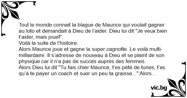 Tout le monde connait la blague de Maurice qui voulait gagner au loto et demandait à Dieu de l’aider. Dieu lui dit "Je veux bien t’aider, mais joue!".