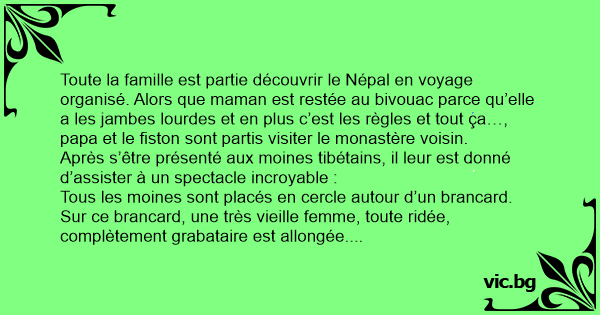 Toute la famille est partie découvrir le Népal en voyage organisé. Alors que maman est restée au bivouac parce qu’elle a les jambes lourdes et en plus c’est les règles et tout ça…, papa et le fiston sont partis visiter le monastère voisin.