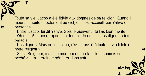 - Pas digne ? Mais enfin, Jacob, n’as-tu pas été toute ta vie fidèle à notre religion ?
