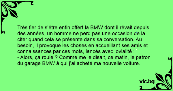 Très fier de s’être enfin offert la BMW dont il rêvait depuis des années, un homme ne perd pas une occasion de la citer quand cela se présente dans sa conversation. Au besoin, il provoque les choses en accueillant ses amis et connaissances par ces mots, lancés avec jovialité :