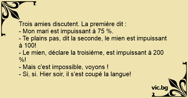 Trois copines discutent un soir : - Mon mari est impuissant à 50% - Ouais, ben c'est pas si grave, moi mon copain est impuissant à 100% - Ne vous plaignez pas : le mien est impuissant à 150% ! - Quoi ? C'est pas possible plus de 100% ! - Ben si : il est impuissant et en plus, il s'est brûlé la...
