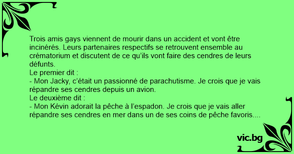 Trois amis gаys viennent de mourir dans un accident et vont être incinérés. Leurs partenaires respectifs se retrouvent ensemble au crématorium et discutent de ce qu’ils vont faire des cendres de leurs défunts.