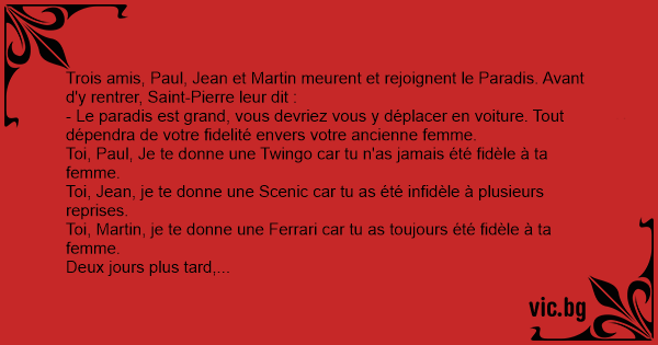 Trois amis, Paul, Jean et Martin meurent et rejoignent le Paradis. Avant d'y rentrer, Sаinт-Pierre leur dit :