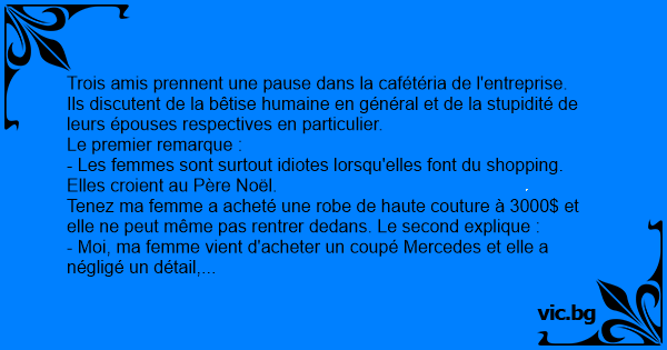 - Moi, ma femme vient d'acheter un coupé Mercedes et elle a négligé un détail, c'est qu'elle n'a pas encore le permis de conduire... Le troisième surenchérit :