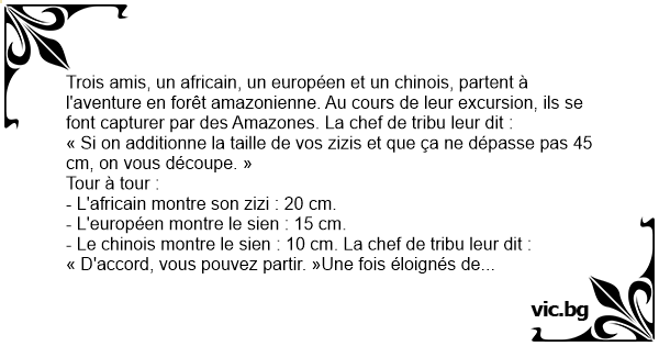 - Le chinois montre le sien : 10 cm. La chef de tribu leur dit :