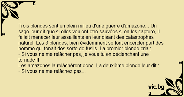 Trois blondes sont en plein milieu d'une guerre d'amazone... Un sage leur dit que si elles veulent être sauvées si on les capture, il fallait menacer leur assaillants en leur disant des catastrophes naturel. Les 3 blondes, bien évidemment se font encercler part des homme qui tenait des sorte de fusils. La premier blonde cria :