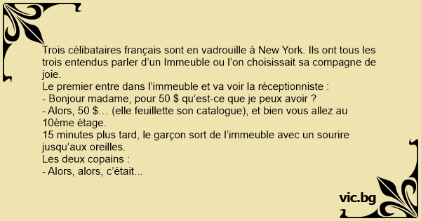 Trois célibataires français sont en vadrouille à New York. Ils ont tous les trois entendus parler d’un Immeuble ou l’on choisissait sa compagne de joie.