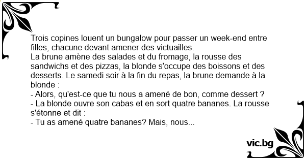 La brune amène des salades et du fromage, la rousse des sandwichs et des pizzas, la blonde s'occupe des boissons et des desserts. Le samedi soir à la fin du repas, la brune demande à la blonde :
