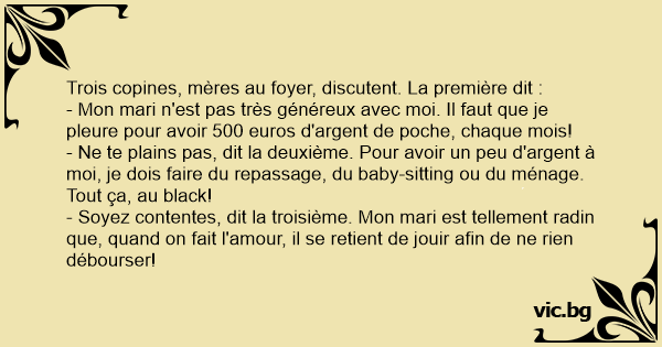 - Soyez contentes, dit la troisième. Mon mari est tellement radin que, quand on fait l'amour, il se retient de jouir afin de ne rien débourser!