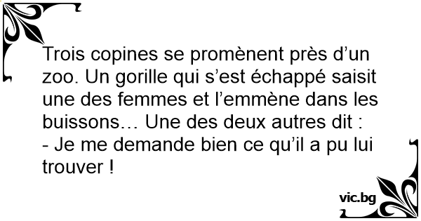 Trois copines se promènent près d’un zoo. Un gorille qui s’est échappé saisit une des femmes et l’emmène dans les buissons… Une des deux autres dit :