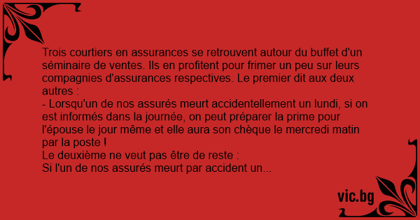Trois courtiers en assurances se retrouvent autour du buffet d'un séminaire de ventes. Ils en profitent pour frimer un peu sur leurs compagnies d'assurances respectives. Le premier dit aux deux autres :