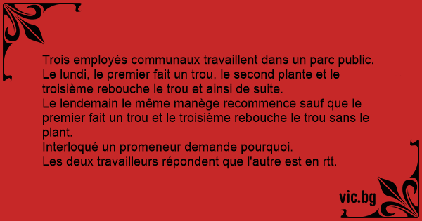 Le lundi, le premier fait un trou, le second plante et le troisième rebouche le trou et ainsi de suite.