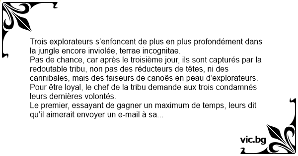 Le premier, essayant de gagner un maximum de temps, leurs dit qu’il aimerait envoyer un e-mail à sa compagne. Le chef sourit, l’invite dans sa hutte et l’installe devant sa toute nouvelle dual-pentium pro workstation, dial isdn et 5 min. plus таrd, le gars est éventré, sa peau lui est délicatement retirée pour en faire un canoë tout neuf.