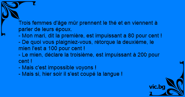 Trois amies discutent. La première dit : - Mon mari est impuissant à 75 %. - Te plains pas, dit la seconde, le mien est impuissant à 100! - Le mien, déclare la troisième, est impuissant à 200 %! -...
