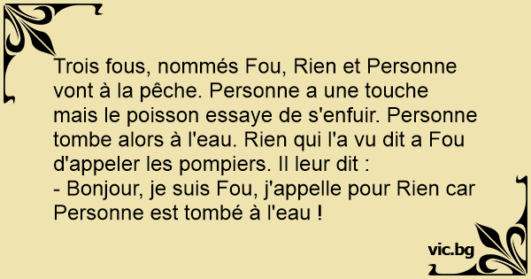 Trois fous, nommés Fou, Rien et Personne vont à la pêche. Personne a une touche mais le poisson essaye de s'enfuir. Personne tombe alors à l'eau. Rien qui l'a vu dit a Fou d'appeler les pompiers. Il leur dit :