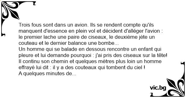 Trois fous sont dans un avion. Ils se rendent compte qu'ils manquent d'essence en plein vol et décident d'alléger l'avion : le premier lache une paire de ciseaux, le deuxième jète un couteau et le dernier balance une bombe...