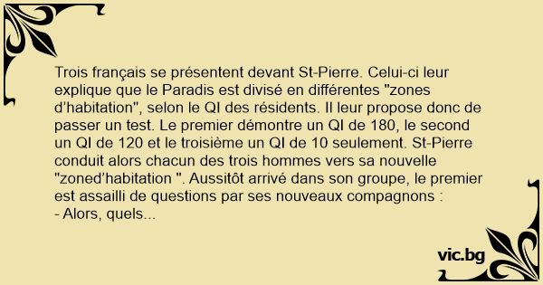 Trois français se présentent devant St-Pierre. Celui-ci leur explique que le Paradis est divisé en différentes "zones d’habitation", selon le QI des résidents. Il leur propose donc de passer un test. Le premier démontre un QI de 180, le second un QI de 120 et le troisième un QI de 10 seulement. St-Pierre conduit alors chacun des trois hommes vers sa nouvelle "zoned’habitation ". Aussitôt arrivé dans son groupe, le premier est assailli de questions par ses nouveaux compagnons :