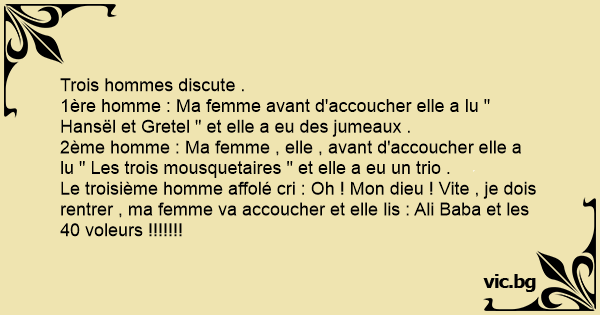 1ère homme : Ma femme avant d'accoucher elle a lu " Hansël et Gretel " et elle a eu des jumeaux .