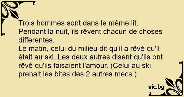Le matin, celui du milieu dit qu'il a rêvé qu'il était au ski. Les deux autres disent qu'ils ont rêvé qu'ils faisaient l'amour. (Celui au ski prenait les bites des 2 autres mecs.)