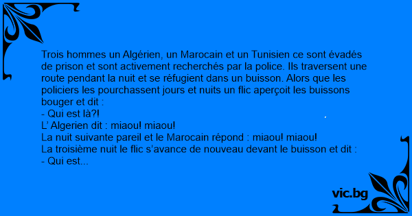 Trois hommes un Algérien, un Marocain et un Tunisien ce sont évadés de prison et sont activement recherchés par la police. Ils traversent une route pendant la nuit et se réfugient dans un buisson. Alors que les policiers les pourchassent jours et nuits un flic aperçoit les buissons bouger et dit :