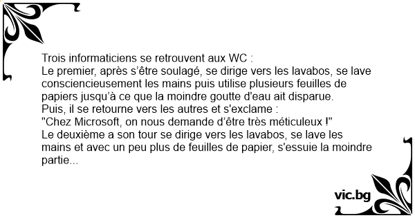 Le premier, après s’être soulagé, se dirige vers les lavabos, se lave consciencieusement les mains puis utilise plusieurs feuilles de papiers jusqu’à ce que la moindre goutte d'eau ait disparue.