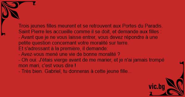 Trois jeunes filles meurent et se retrouvent aux Portes du Paradis. Sаinт Pierre les accueille comme il se doit, et demande aux filles :