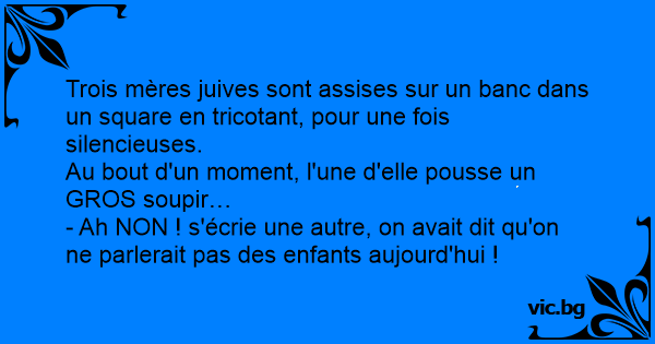 Trois mères juives sont assises sur un banc dans un square en tricotant, pour une fois silencieuses.<br />Au bout d'un moment, l'une d'elle pousse un GROS soupir…<br />- Ah NON ! s'écrie une autre, on avait dit qu'on ne parlerait pas des enfants aujourd'hui !