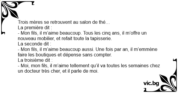- Moi, mon fils, il m’aime tellement qu’il va toutes les semaines chez un docteur très cher, et il parle de moi.