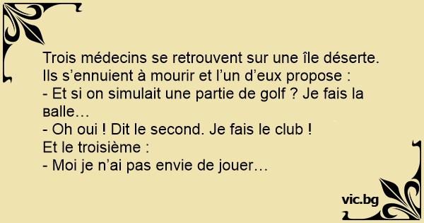 Trois médecins se retrouvent sur une île déserte. Ils s’ennuient à mourir et l’un d’eux propose :